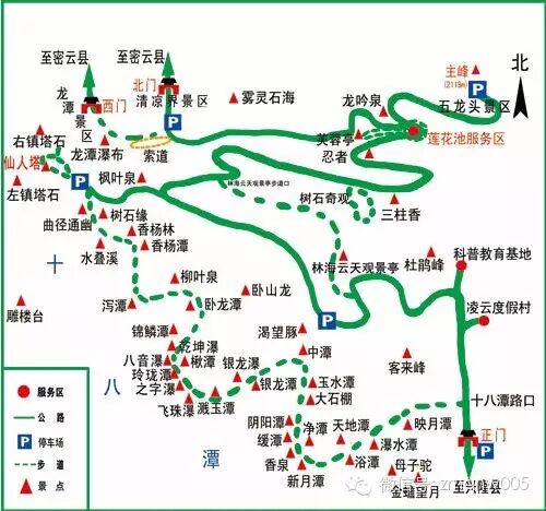 B:正门→仙人塔景区(仙人塔、十八潭、林海云天观景亭、树石奇观等)→莲花池林间环形观景步道→莲花池服务区食宿→五龙头景区(燕山主峰、云海日出、青龙岭等)→龙潭景区(龙潭瀑布、金雕崖观景亭等)→清凉界景区(大字石、三像石、千年古香杨等)→北门。
