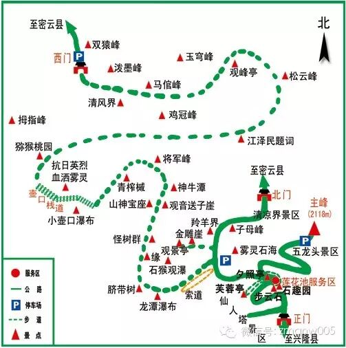 正门←→仙人塔景区(仙人塔、十八潭、林海云天观景亭、树石奇观等)←→五龙头景区(燕山主峰、青龙岭等)←→莲花池服务区午餐←→龙潭景区(龙潭瀑布、金雕崖观景亭等)←→清凉界景区(大字石、三像石、千年古香杨等)←→北门。