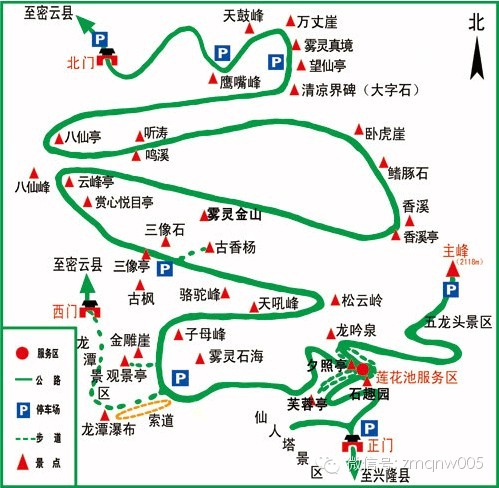 C:北门→清凉界景区(大字石、三像石、千年古香杨等)→龙潭景区(龙潭瀑布、金雕崖观景亭等)→莲花池林间环形观景步道→莲花池服务区食宿→五龙头景区(燕山主峰、云海日出、青龙岭等)→仙人塔景区(树石奇观、林海云天观景亭、仙人塔、十八潭等)→正门。